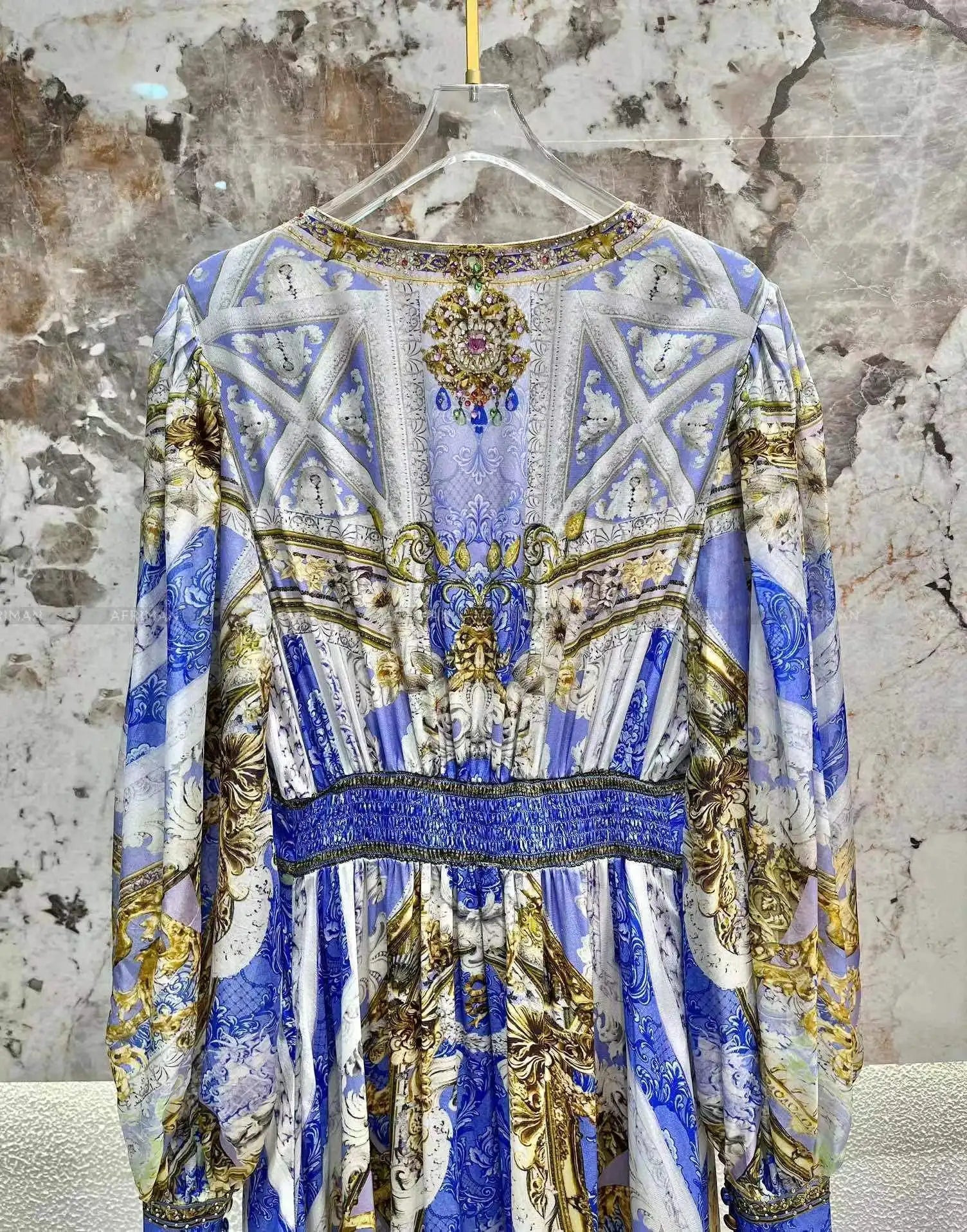 This exquisite designer dress is the epitome of timeless elegance, blending vintage charm with luxurious silk fabric. Designed with a non-stretch fit for a polished look, the dress features a classic A-line silhouette that flatters the figure while offering ease of movement. The V-neckline is adorned with delicate beading, adding a touch of sophistication to the vibrant printed pattern.