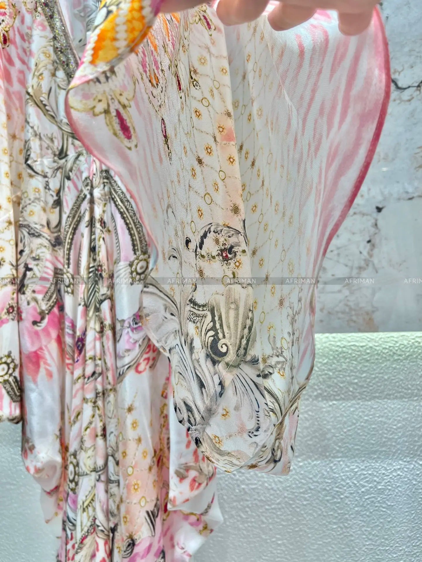 This exquisite designer dress effortlessly combines boldness and elegance, making it a standout piece for women who appreciate both style and comfort. Featuring a slight stretch for ease of movement, this dress is crafted from a luxurious blend of silk and cotton. The eye-catching leopard print gives it a fierce, fashion-forward edge, while the intricate beading along the V-neckline adds a touch of vintage sophistication.